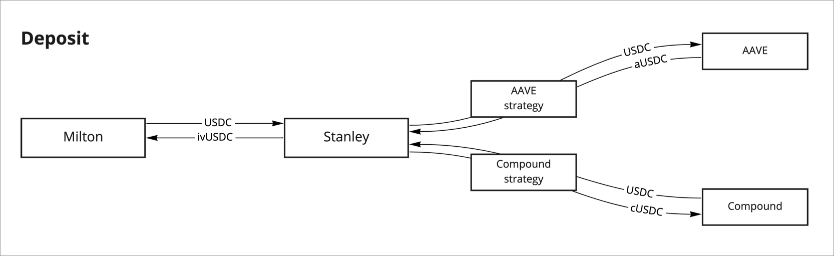 When Milton has excess free funds in custody, it will deposit them to Stanley. It will receive ivTokens which serve as accounting tokens in exchange for that. Further, Stanley will deposit stable to one of the supported money markets and receive accounting tokens in exchange.