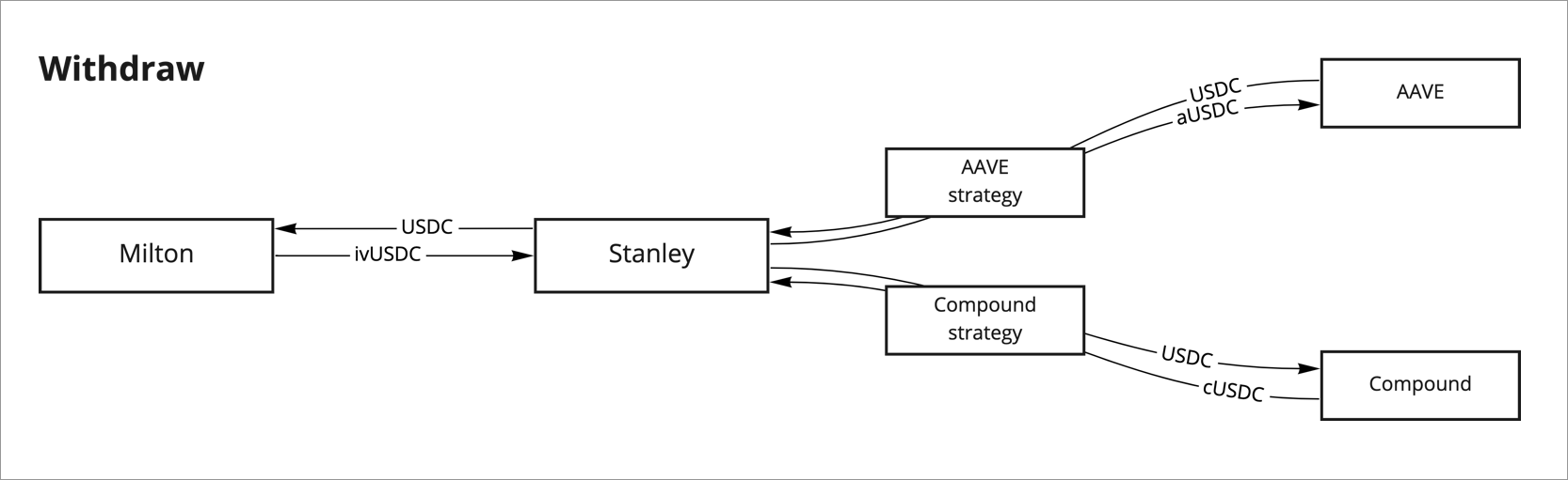 The withdrawal process is a reverse of a deposit: When Milton requests to withdraw assets from Stanley, then Stanley calculates the number of accounting tokens to withdraw from the money market selected according to its logic. It then redeems the accounting tokens and transfers the proceeds to Milton while burning the corresponding liquidity tokens.