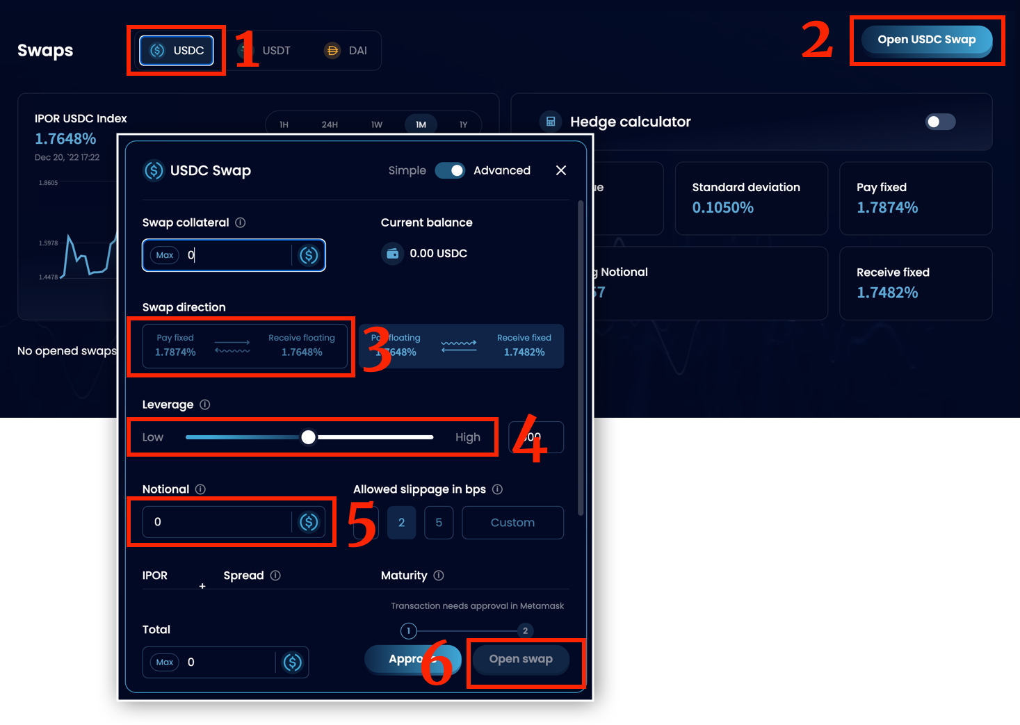 Open swap. Remember that the Maturity of a swap is 28 days. Your hedge is good for this long. If you close your borrow position before the 28 days maturity of your swap, you can also close the swap on the IPOR Protocol.